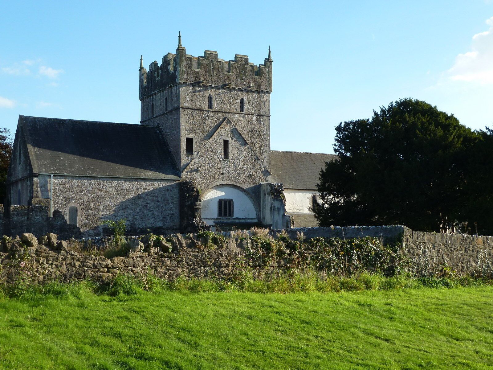 Ruins of Ewenny Priory, farm building, and mansion.