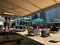 Travelers relax poolside under the Florida sun or grab a bite at the deli before heading out to explore Dania Pointe with convenient on-site car rentals.