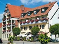 Flower decorated hotel. Friendly staff. Nice modern room with a balcony overlooking the flower decorated town square with a fountain. Nice European breakfast. Parking in alley behind hotel. Had a very pleasant one night stay on our way to Nuremburg.