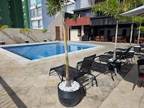 Travelers find peaceful relaxation at Hotel Pousada Natureza, where an inviting outdoor pool sits amid lush gardens perfect for unwinding after a day of exploration