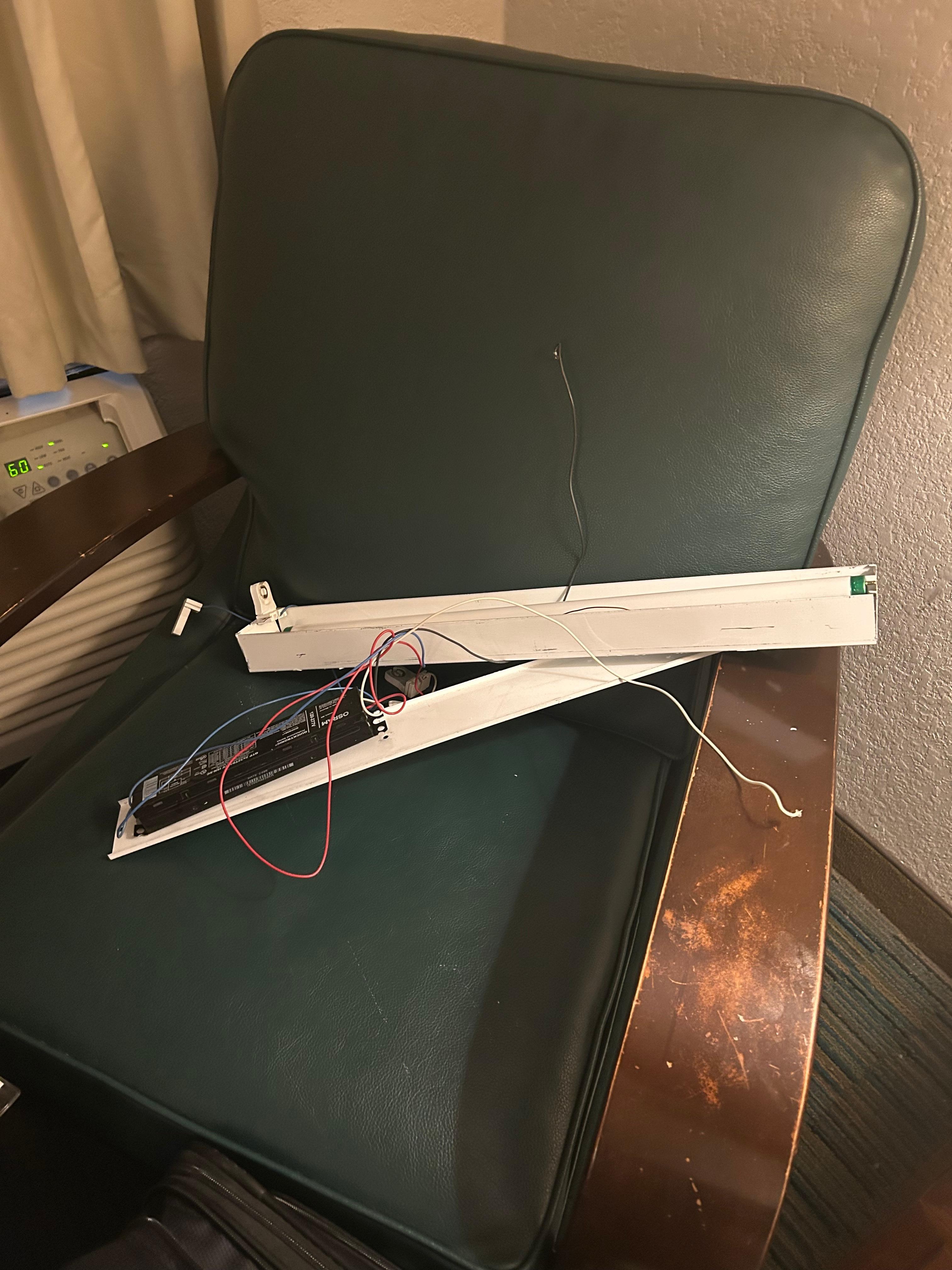 When I tell you that the room was comically in disrepair, it doesn’t begin to paint the proper picture. When I opened the door, roaches scurried across the floor and under the carpet. ALL of the light fixtures had been ripped out of the wall. There was an unusual ‘office chair’ by one of the beds, that was covered in who knows what.