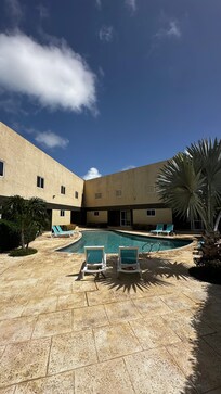 A tropical retreat in Aruba where guests can relax by the pool, surrounded by lush gardens, while enjoying modern amenities and attentive service