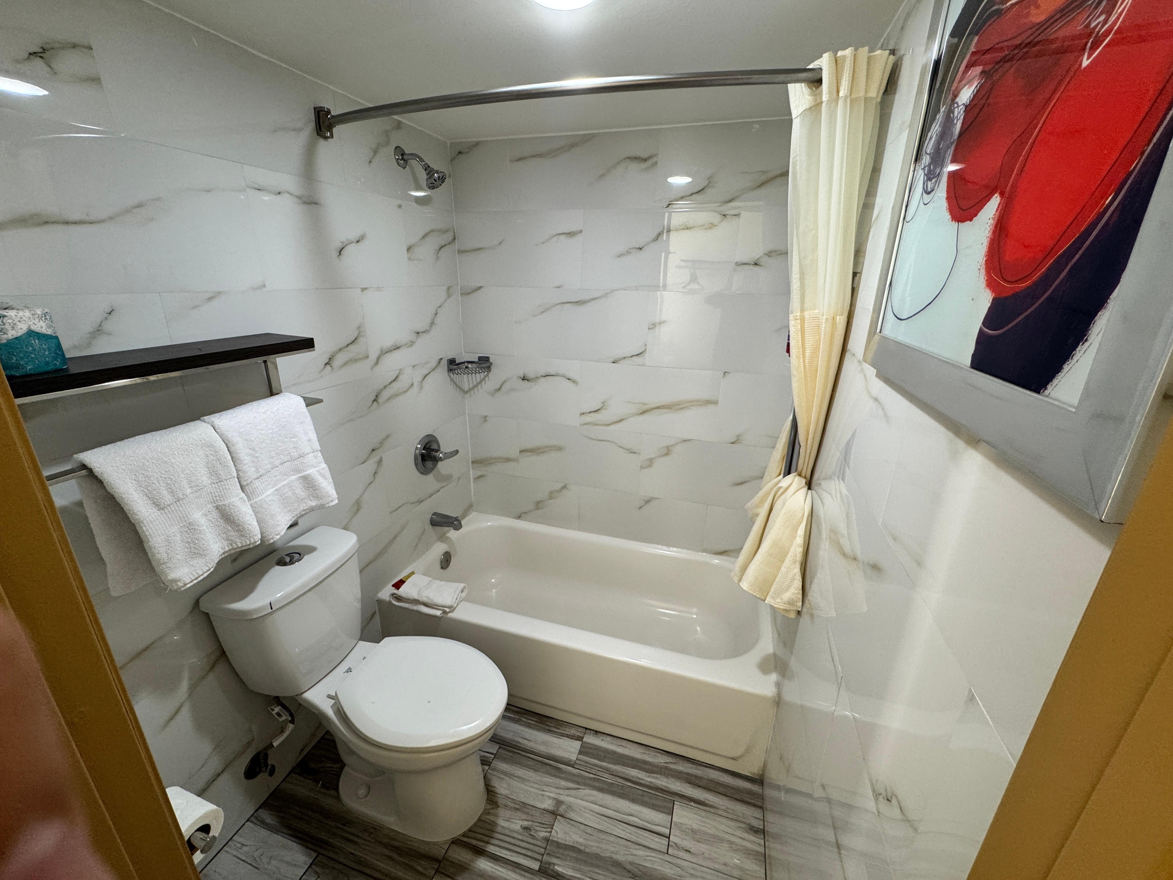 Bathrooms with shower/tub combinations and free toiletries