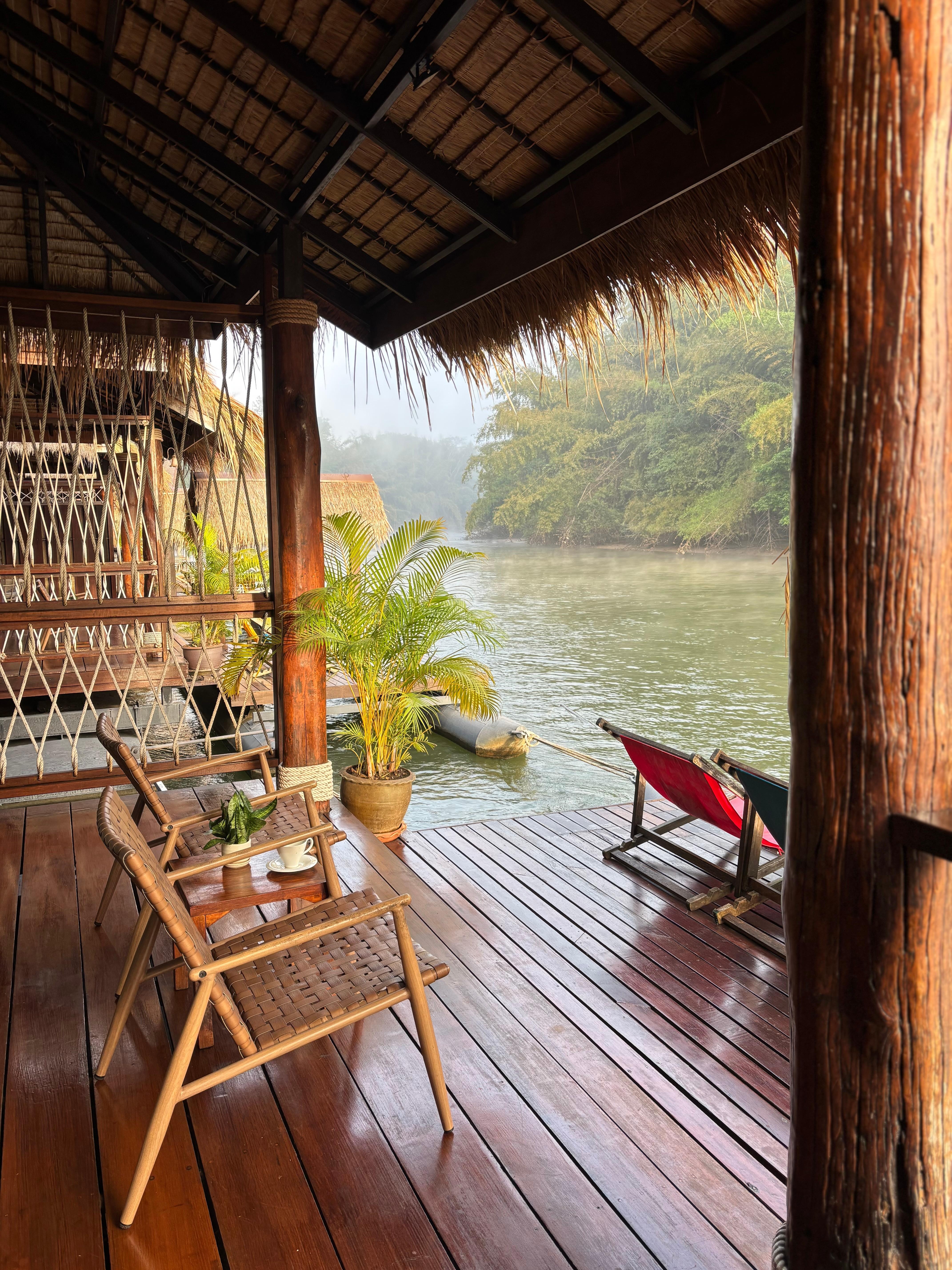 Peaceful floating retreat on the River Kwai where travelers can explore by kayak or boat before unwinding with riverside relaxation