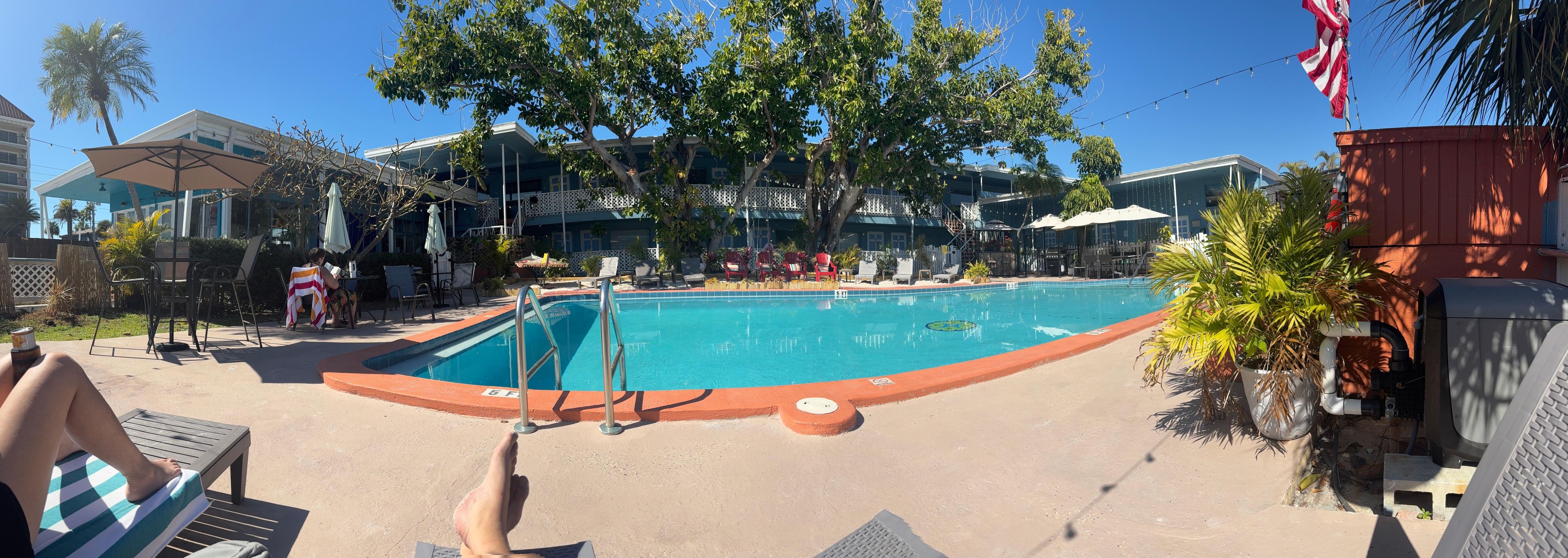 Clean room, friendly staff, warm pool. Very quaint, old Florida vibe. Public beach access right across the street. Shops, and restaurants within easy walking distance. The only negative to note, is that the doors are very old, and do not seal. You can hear every person walking/talking outside of your room very easily. But, would stay there again.