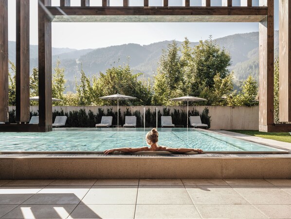 Travelers can relax on sun loungers by either of two outdoor pools or rejuvenate with fitness classes after exploring the magnificent mountain trails nearby