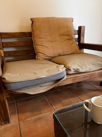 Living room - very uncomfortable seating. Cushions were stained & torn. One back cushion on each of the two seater sofas and a chair. Good thing there was only three of us!