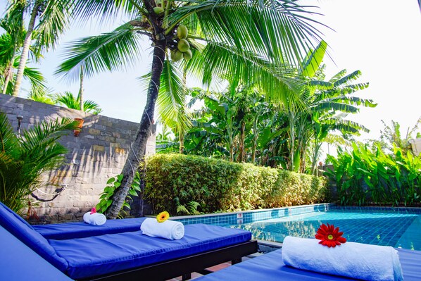 Rural Scene Villa, surrounded by greenery, offers a quiet escape. Enjoy the daily manager's reception, start mornings with breakfast, and explore on rental bicycles. Unwind at the outdoor pool with sun loungers after a day of adventures.