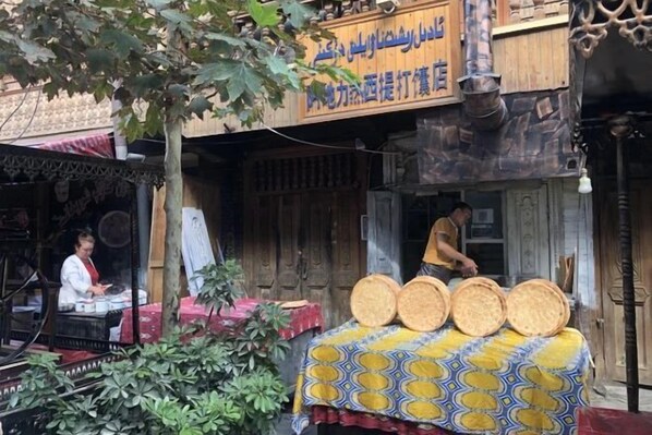 Travelers can start their day with a hearty breakfast before exploring Kashgar Old Town's hidden gems, with secure luggage storage making sightseeing convenient