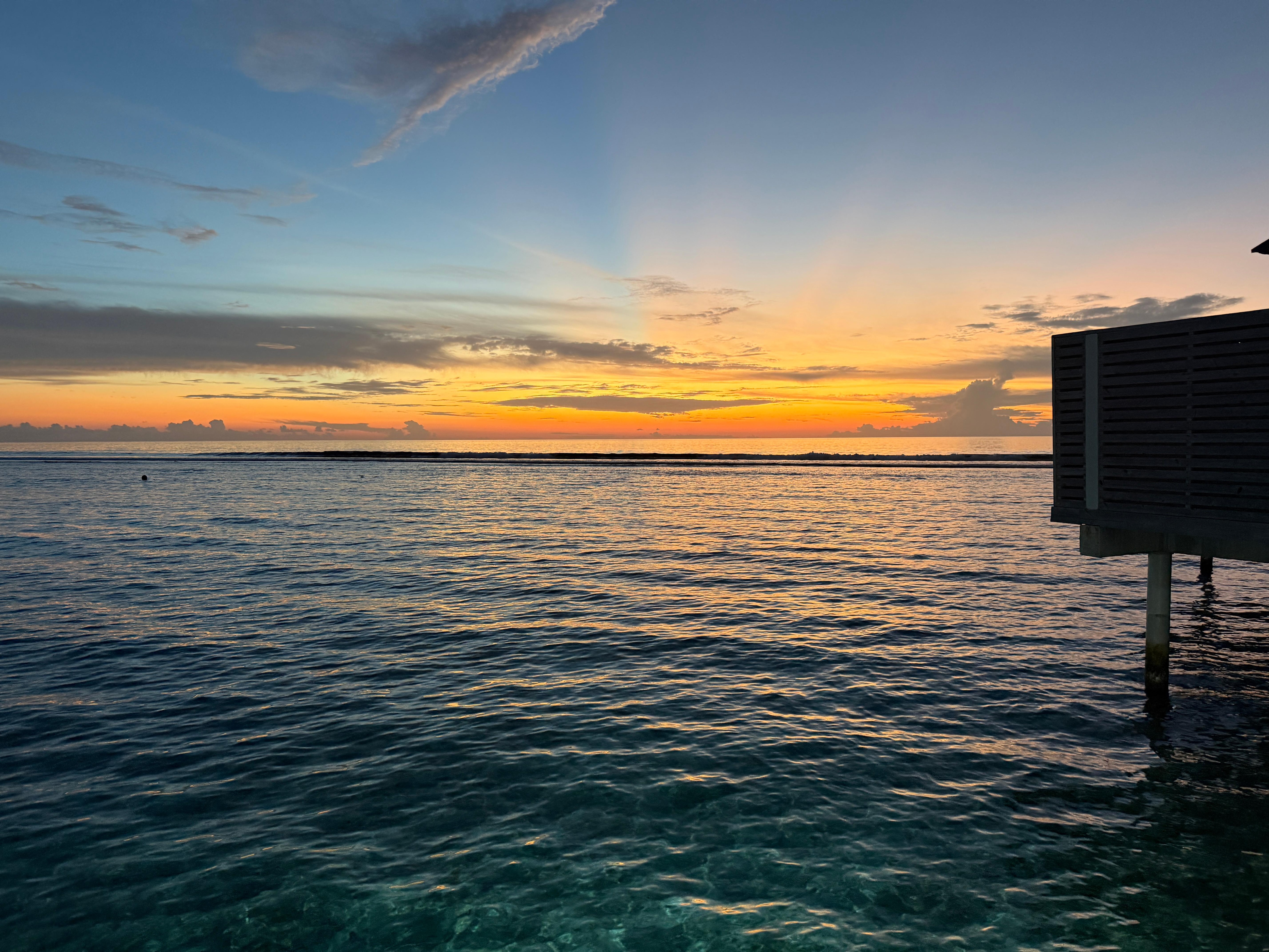 Had room 524 amazing views for sunrise and ocean views 100% recommend, beware it’s at the end of the jetty decently long walk. Rooms are the only place for A/C which in the heat of the day, still can get really hot in rooms. Spa was amazing. Staff was very friendly hospitality is a 5 star. Restaurants are nothing to write home about, fancy type food that’s ok at best. It’s a very romantic place for you and your partner but very hot and humid no restaurants or bars have air conditioning so dressing up and putting makeup on is a mistake since you’ll just be sweating the whole time. Make sure to bring plenty of sunscreen buying it there a regular bottle was $60 bucks!
