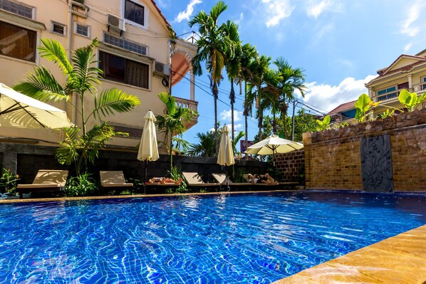Travelers unwind by the palm-fringed pool at this Siem Reap retreat, where rejuvenating massages complement the authentic local dining experience