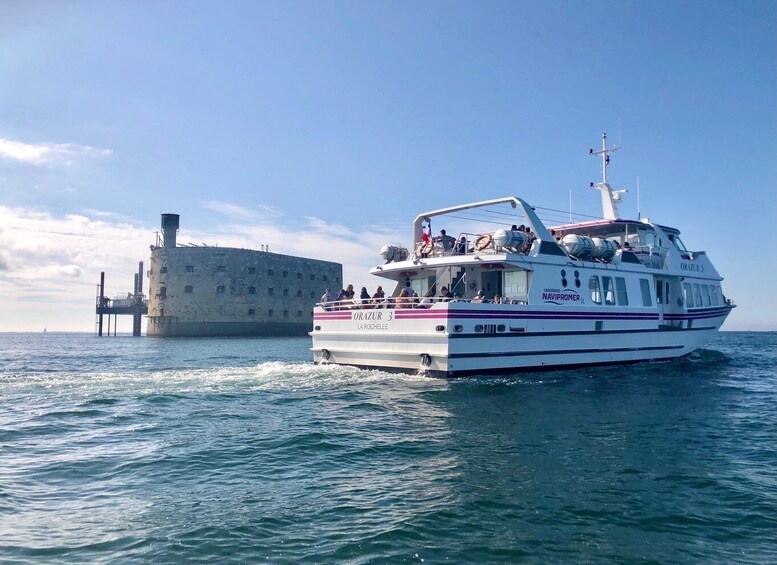 From the Old Port of La Rochelle, cast off to enjoy the passage between the two famous towers of La Rochelle… The Saint-Nicolas Tower and the Tour de la Chaîne; symbols of the port city. Your journey continues slowly as you sail through the channel lined by the Tour des 4 Sergents, the Les Minimes marina, the Richelieu Tower, and the End of the World Lighthouse. Cross the La Rochelle harbor and the Pertuis d'Antioche, bordered by the islands of Ré, Oléron, and Aix, towards the legendary Fort Boyard, an imposing maritime fortress built in the heart of the ocean. You'll enjoy a breathtaking view of this iconic building, made famous by the TV show. Check out its impressive structure, built to protect the entrance to the Charente estuary. Throughout the cruise, let the sea breeze carry you away while enjoying the commentary, rich in historical anecdotes about this fascinating region, between land and sea. This maritime walk will offer you a break of relaxation and discovery, without a stopover… Duration: approximately 2 hours and 10 minutes.