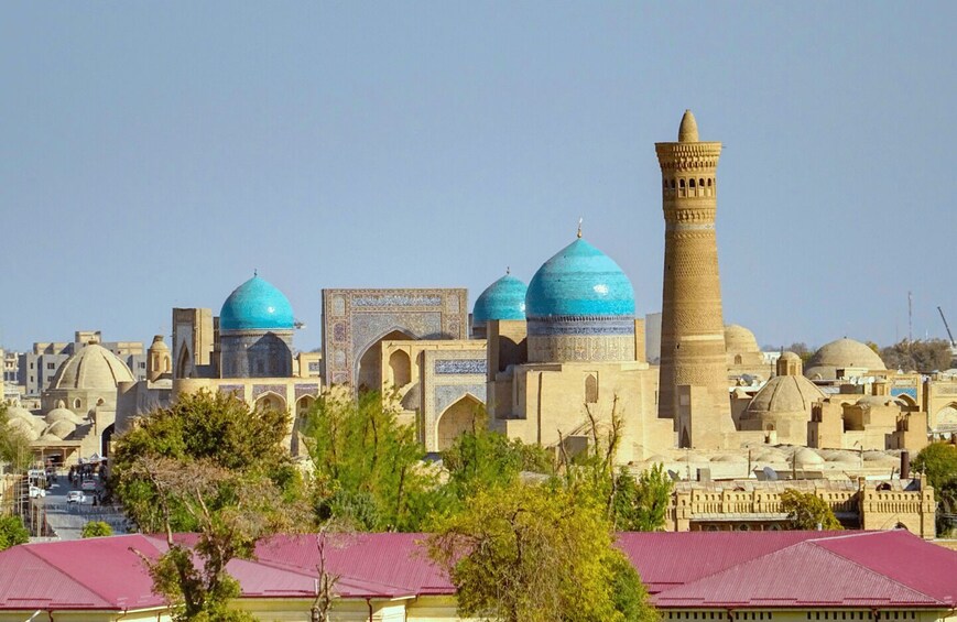 Start your walking sightseeing tour in Bukhara. Visit Lyabi-Khauz Complex (a lively square with a pool, old madrasahs, and shady trees, a favorite meeting spot), Magoki-Attori Mosque (one of Bukhara’s oldest mosques, partly underground, with pre-Islamic layers of history), Chor-Minor Madrasah (a small madrasa with four unique turquoise-domed towers, very photogenic), Trade domes (historic covered bazaars where silk, jewelry, and handicrafts were traded for centuries), Kalyan Minaret (a 47 m tower from the 12th century, spared by Genghis Khan, symbol of Bukhara), Kalyan Mosque (huge mosque with a vast courtyard, able to hold up to 10,000 worshippers), and Miri-Arab Madrasah (a still-functioning Islamic school, famous for its grand blue-tiled façade), Ulugbek and Abdulazizkhan madrasahs (side by side: Ulugbek’s simple elegance and Abdulazizkhan’s ornate design), Ark Fortress (former residence of Bukhara’s emirs, with royal courts, halls, and museums inside), and Bolo-Khauz Mosque (a mosque with carved wooden columns reflected in a pool, opposite the Ark). End of the tour.