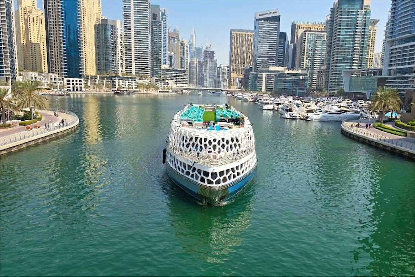 從杜拜碼頭區出發,欣賞美景。乘船穿過朱美拉海灘公寓、杜拜摩天輪,前往位於著名的朱美拉棕櫚島前的亞特蘭蒂斯酒店。
