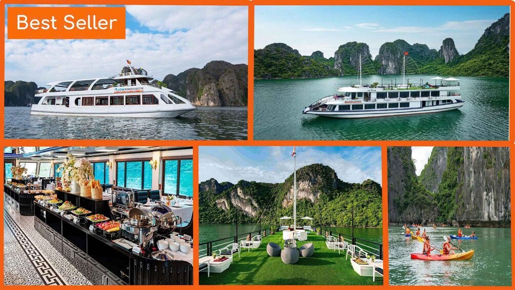 - 12:00:抵達團洲,等待船長辦理出發手續、歡迎登船、導遊進行安全簡報,然後啟航在傳奇的下龍灣進行 5 小時的旅程。