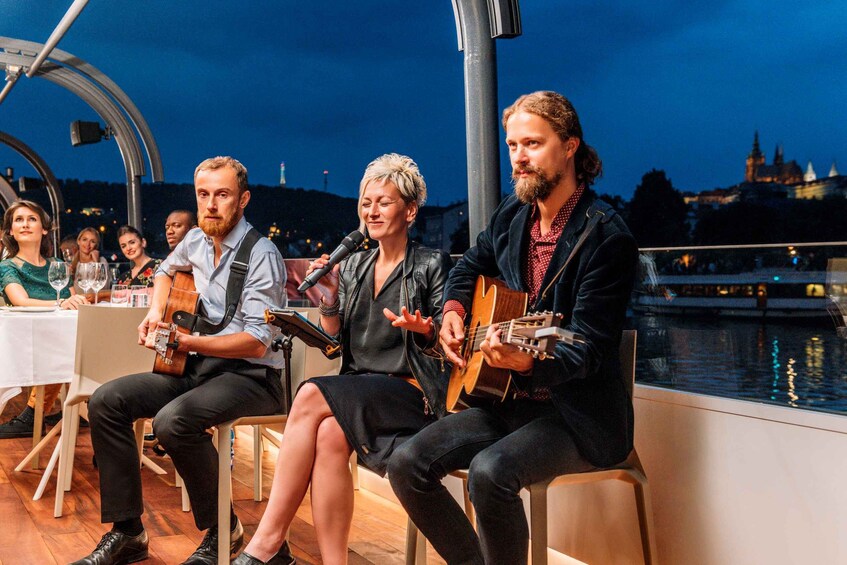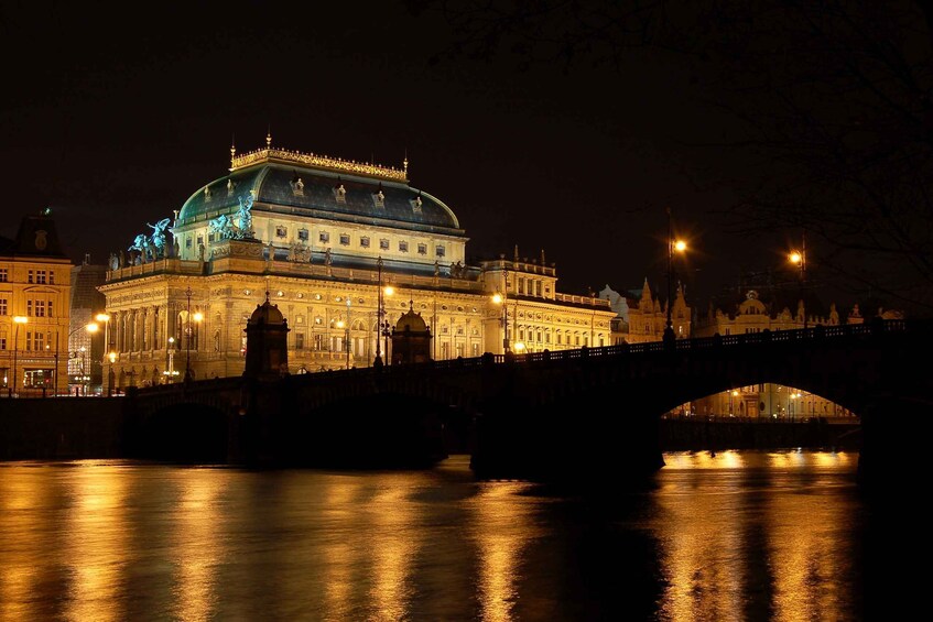 Then, board a luxury boat on the Vltava River, where a welcome drink awaits before you set sail on a 3-hour-cruise. Sit back and enjoy views of Prague Castle against the night sky. Cruise past Strahov Monastery, St. Nicholas Church, and Petrin Tower, and go beyond the city center limits to Vysehrad Castle and the Dancing House.